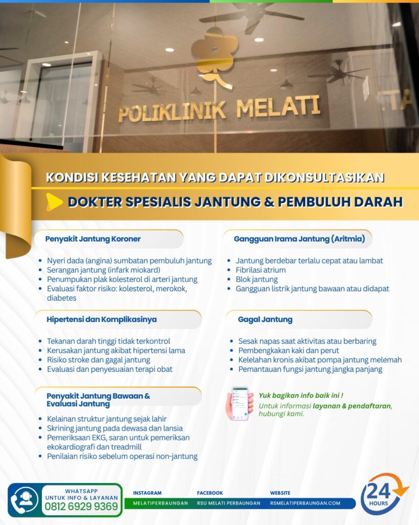 Menjawab kebutuhan tersebut, Rumah Sakit Umum (RSU) Melati Perbaungan terus berkomitmen memberikan layanan kesehatan jantung yang komprehensif dan mudah diakses oleh masyarakat. Melalui Poliklinik Jantung, pasien dapat berkonsultasi langsung dengan dokter spesialis jantung dan pembuluh darah yang berpengalaman dan profesional.